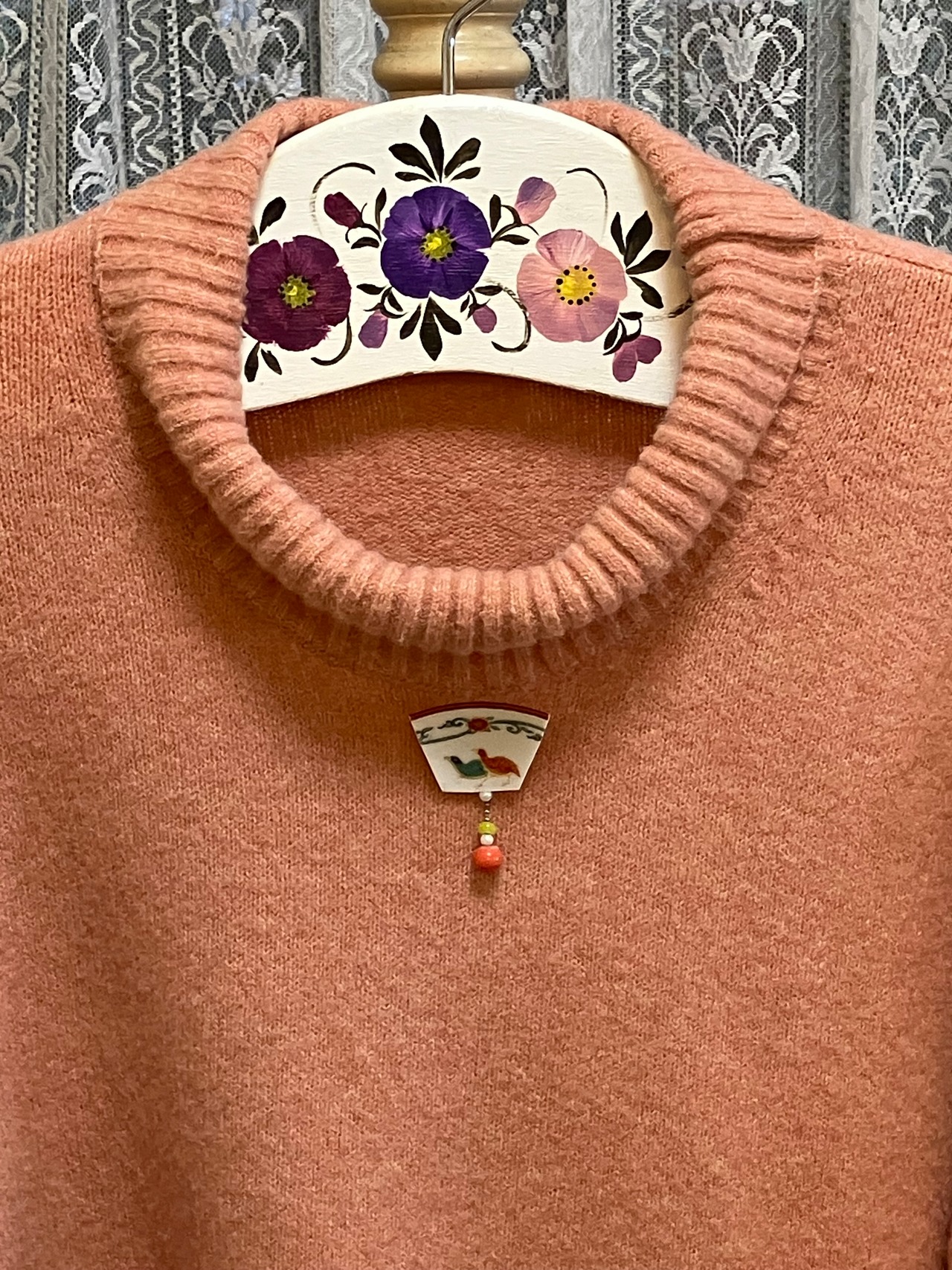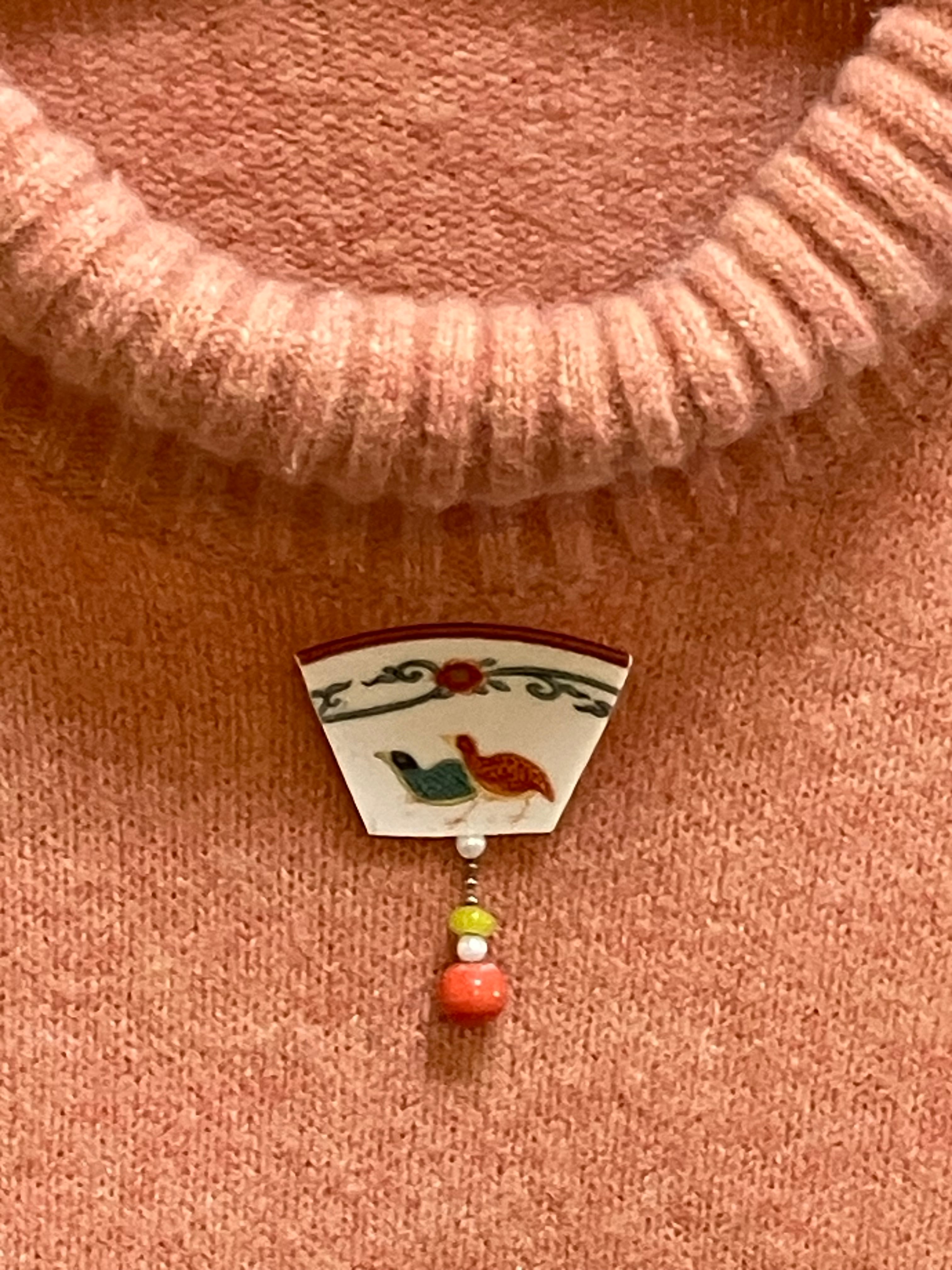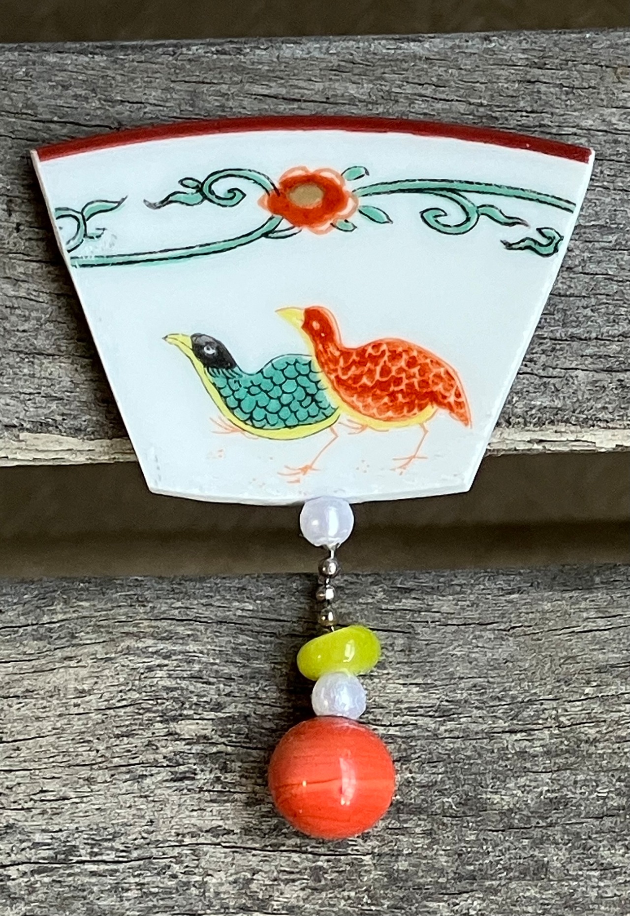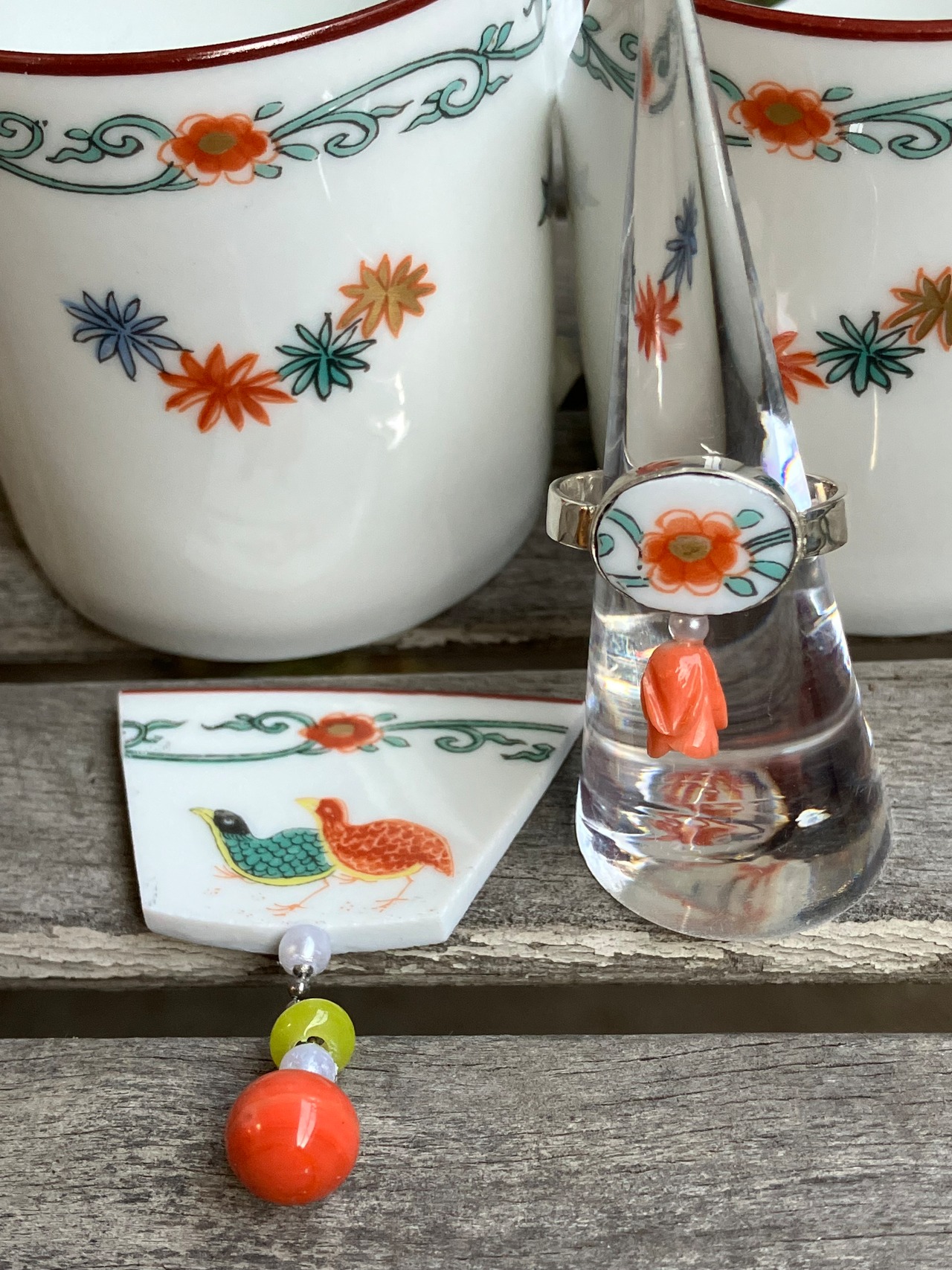 切り取った磁器の下に本珊瑚の珠を揺れるように付けました。