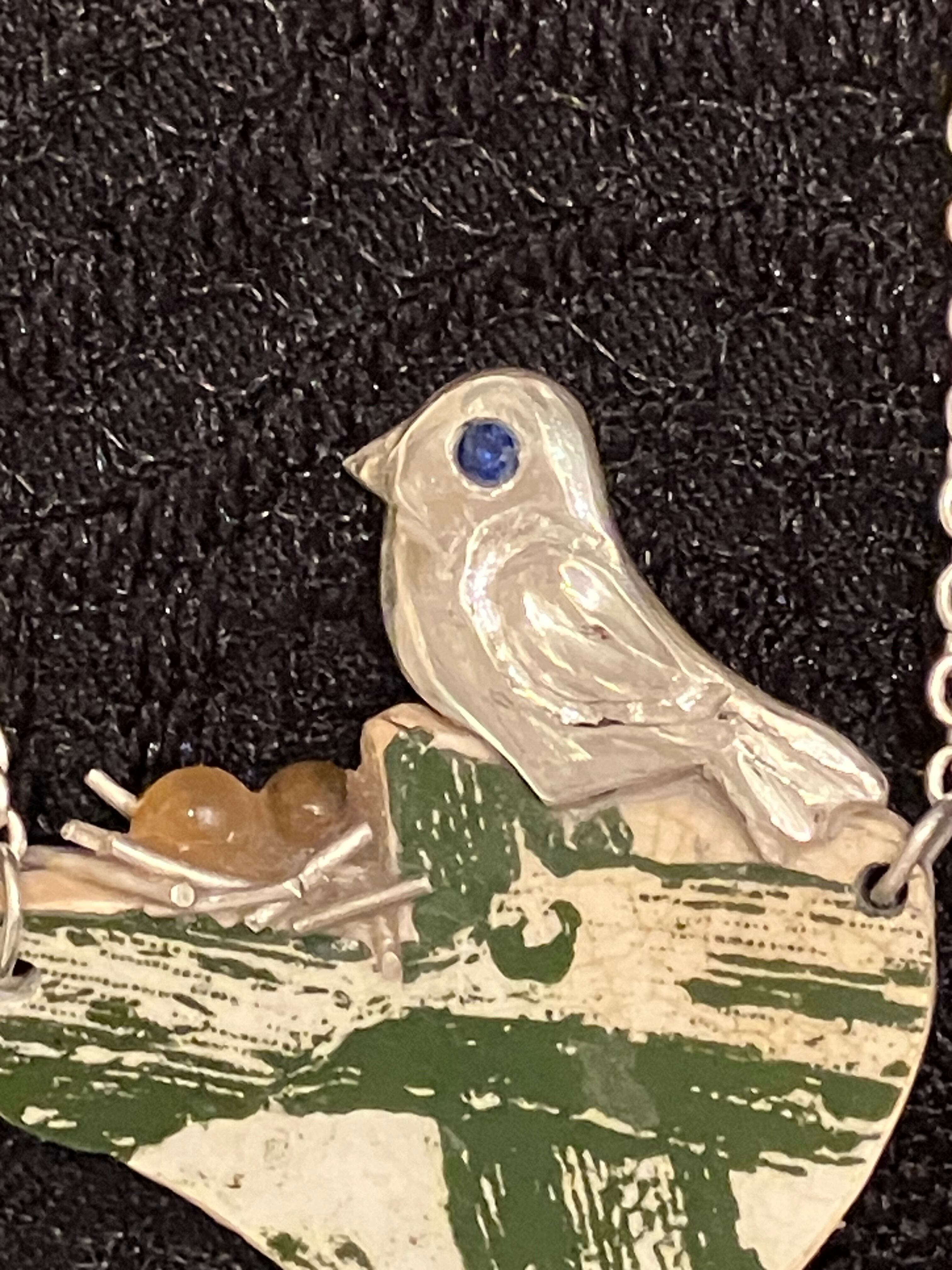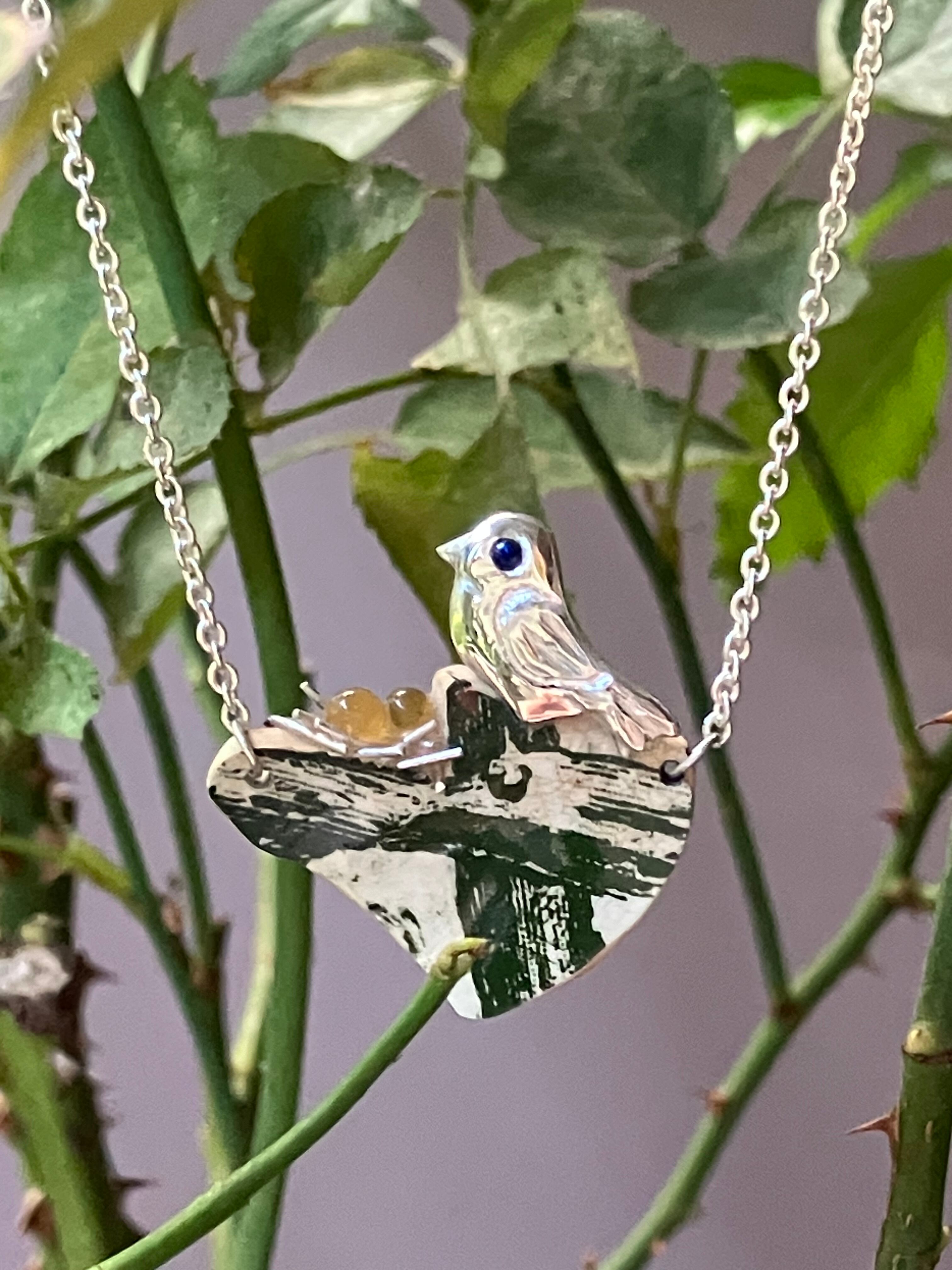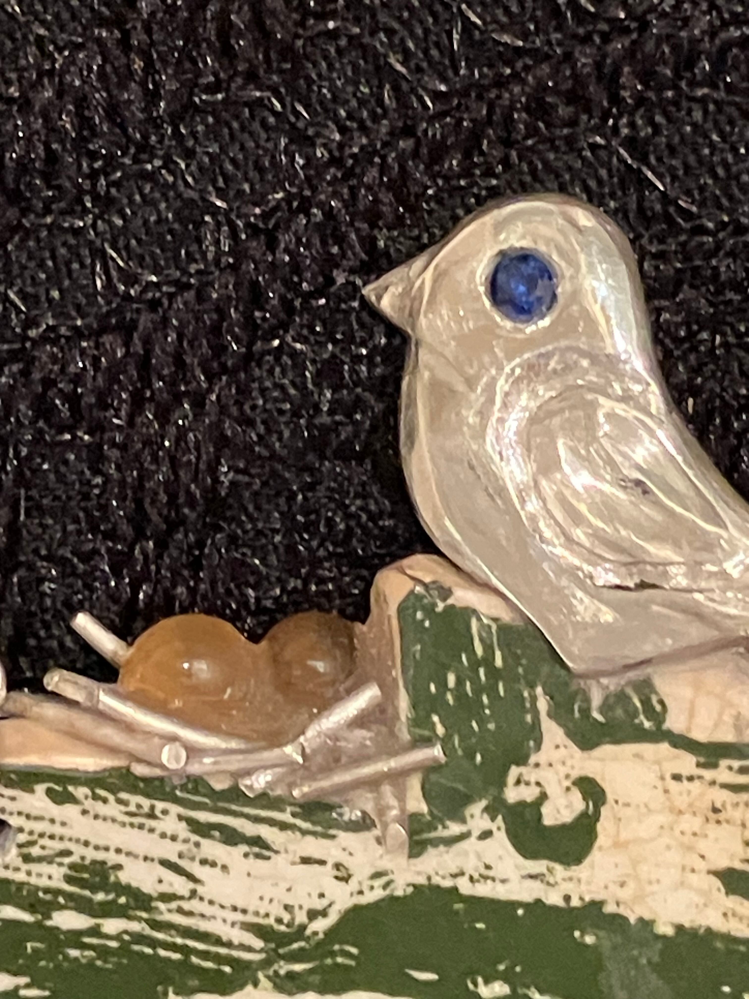 アンティーク陶器の木の柄の部分を切り出して、その上に小鳥と卵が入っている巣を乗せました。