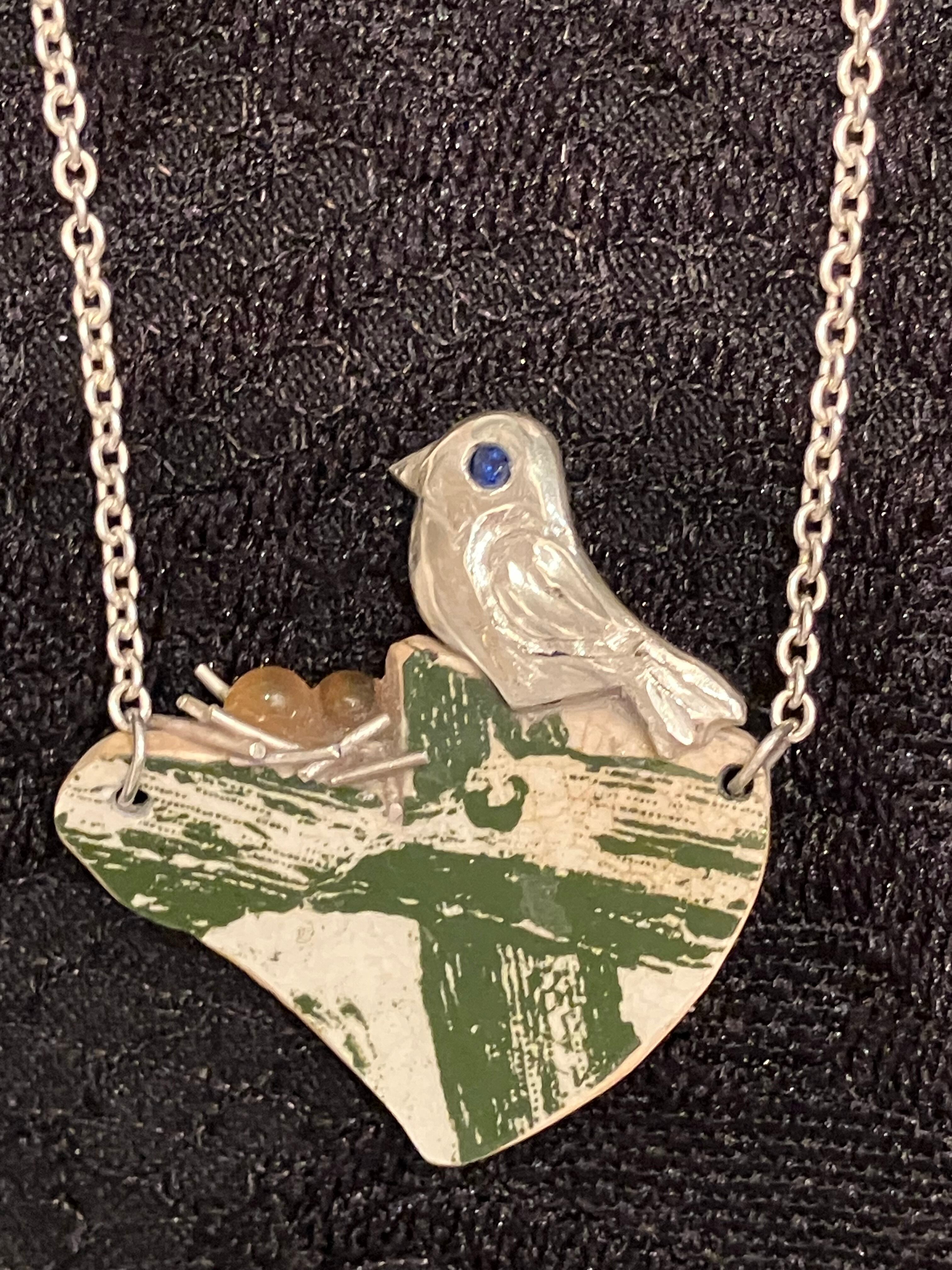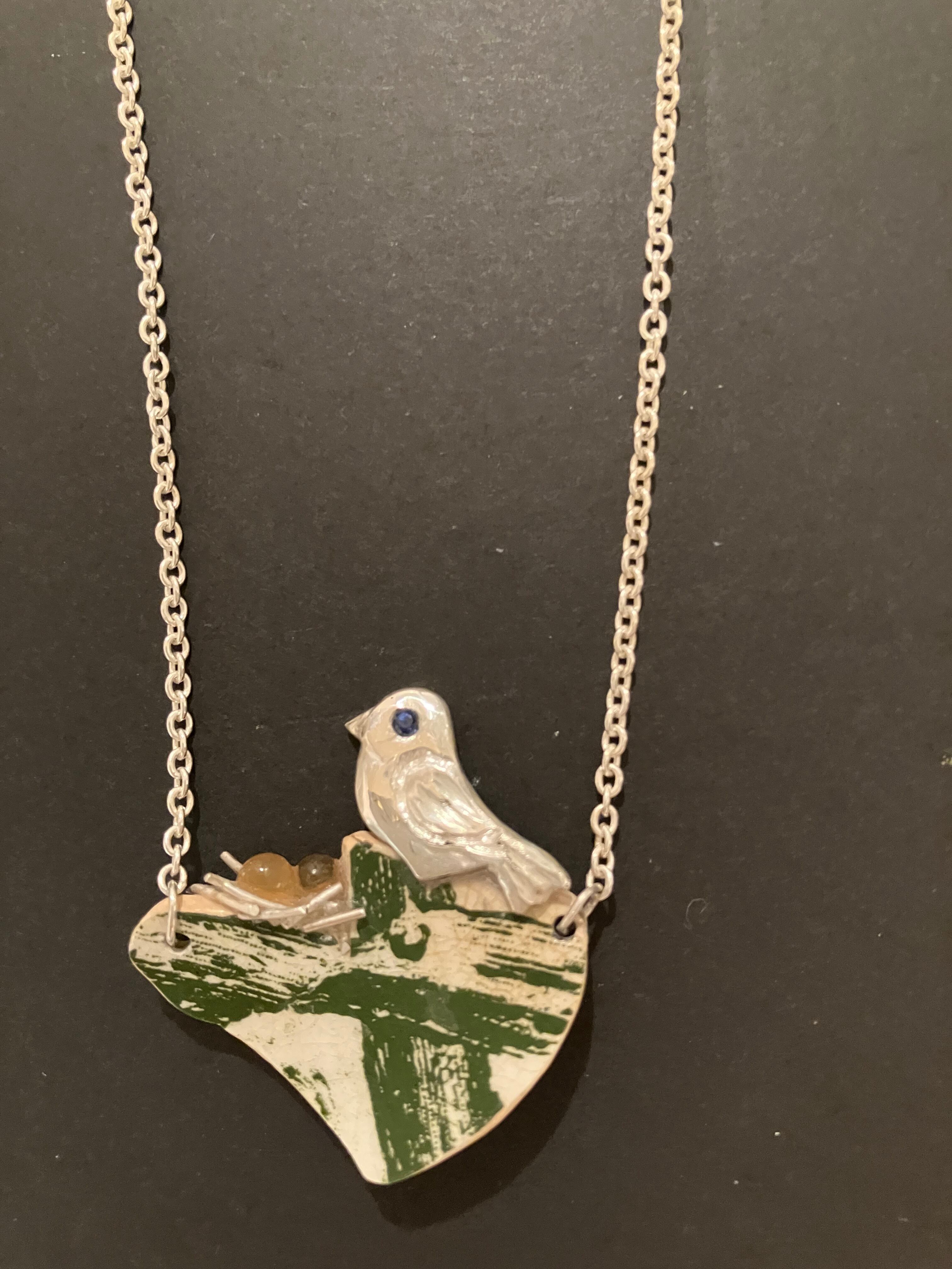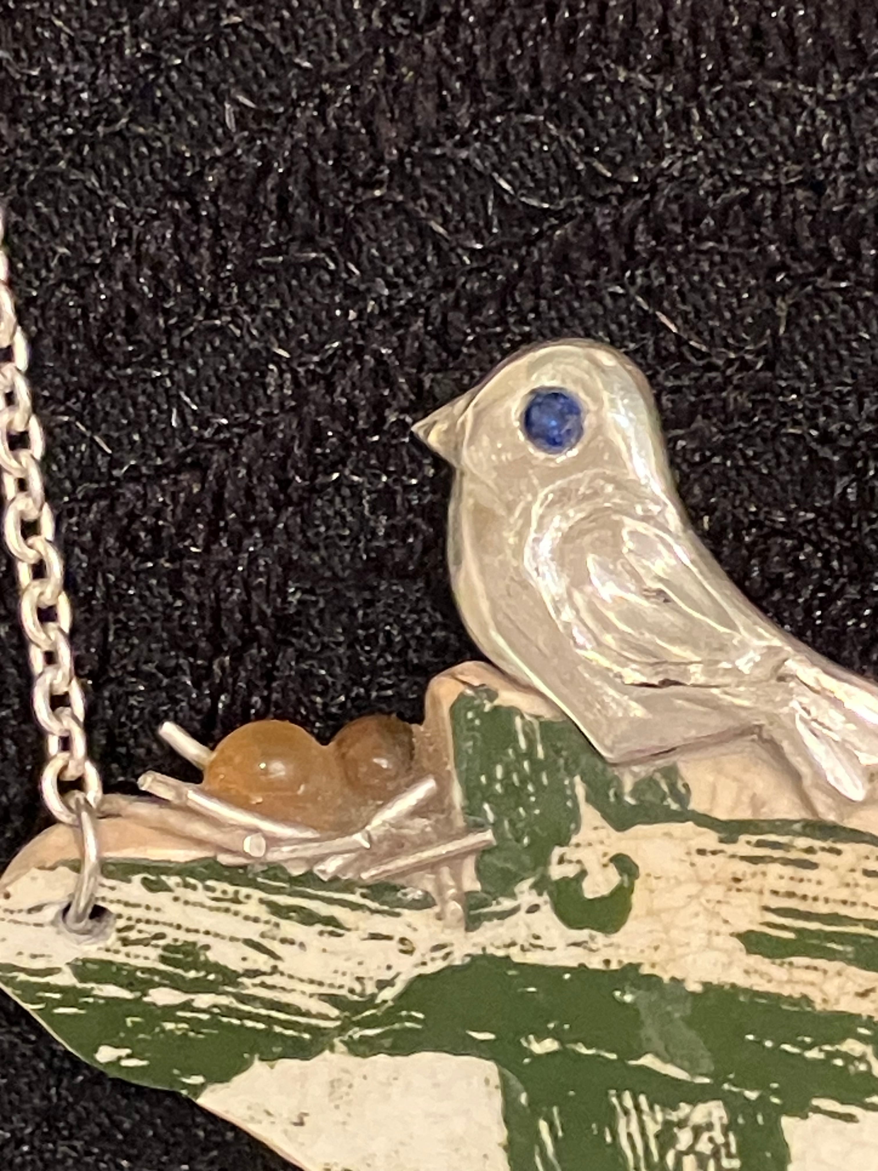 アンティーク陶器の木の柄の部分を切り出して、その上に小鳥と卵が入っている巣を乗せました。