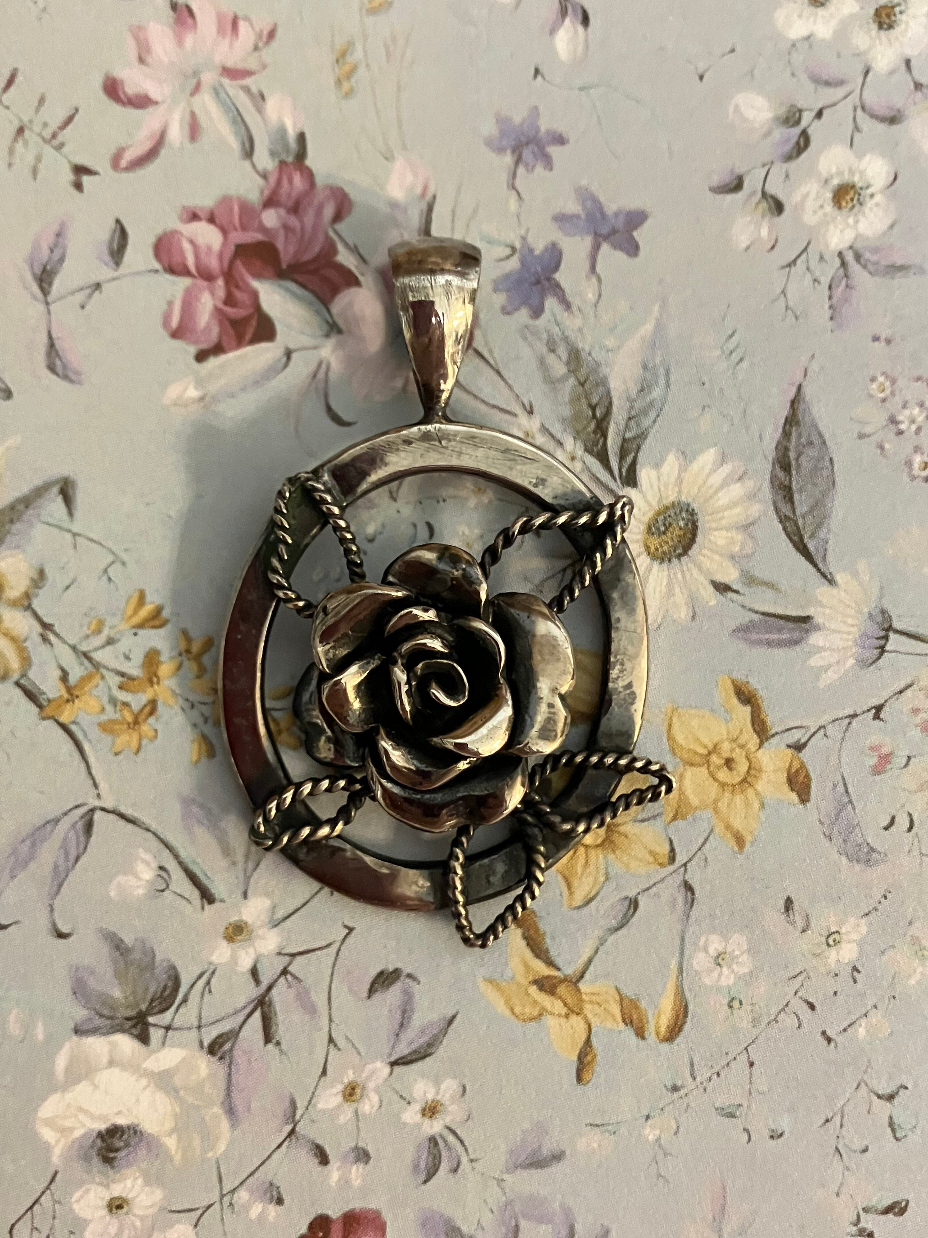 透かし薔薇のペンダントトップのいぶしバージョンです。