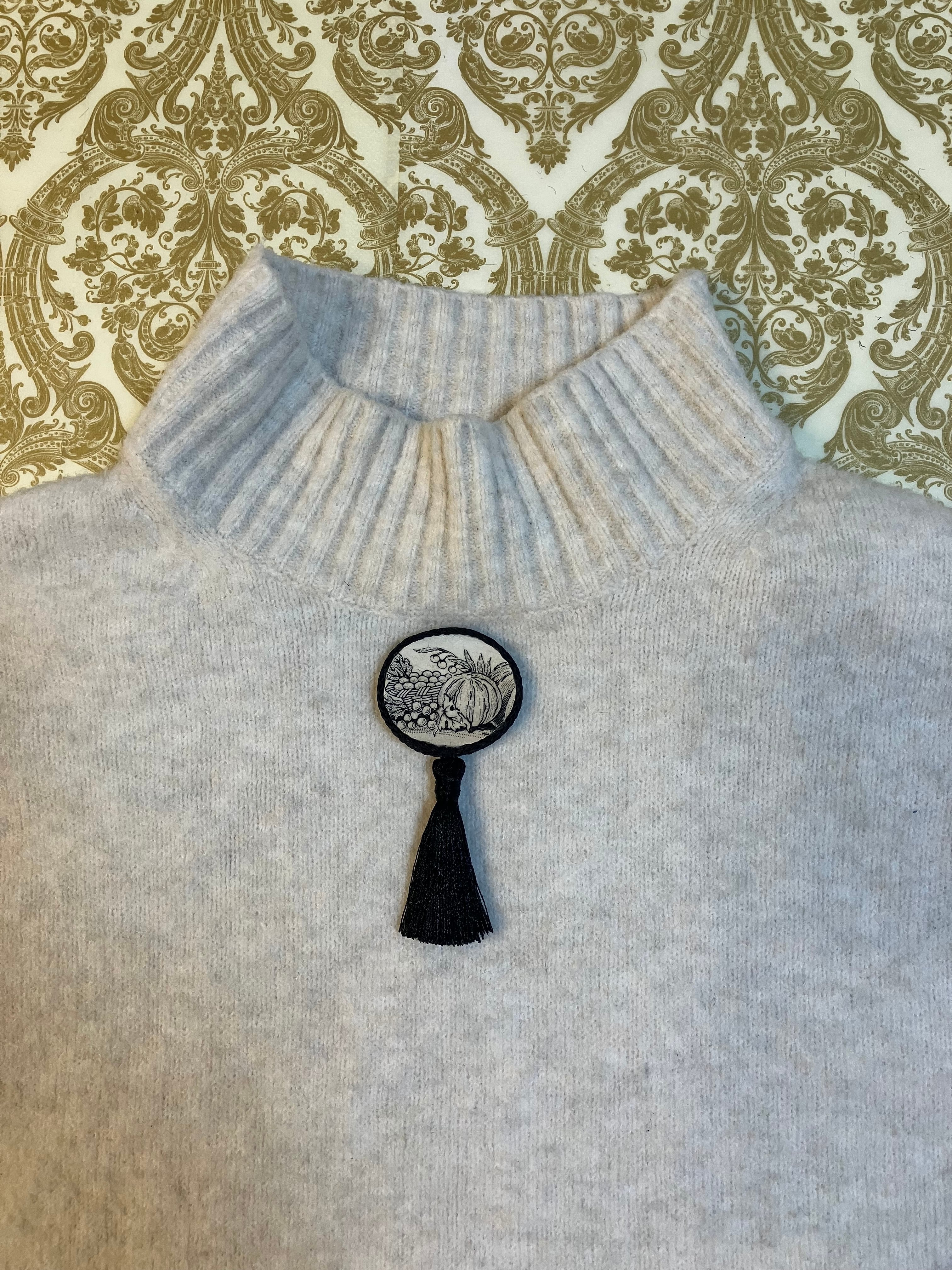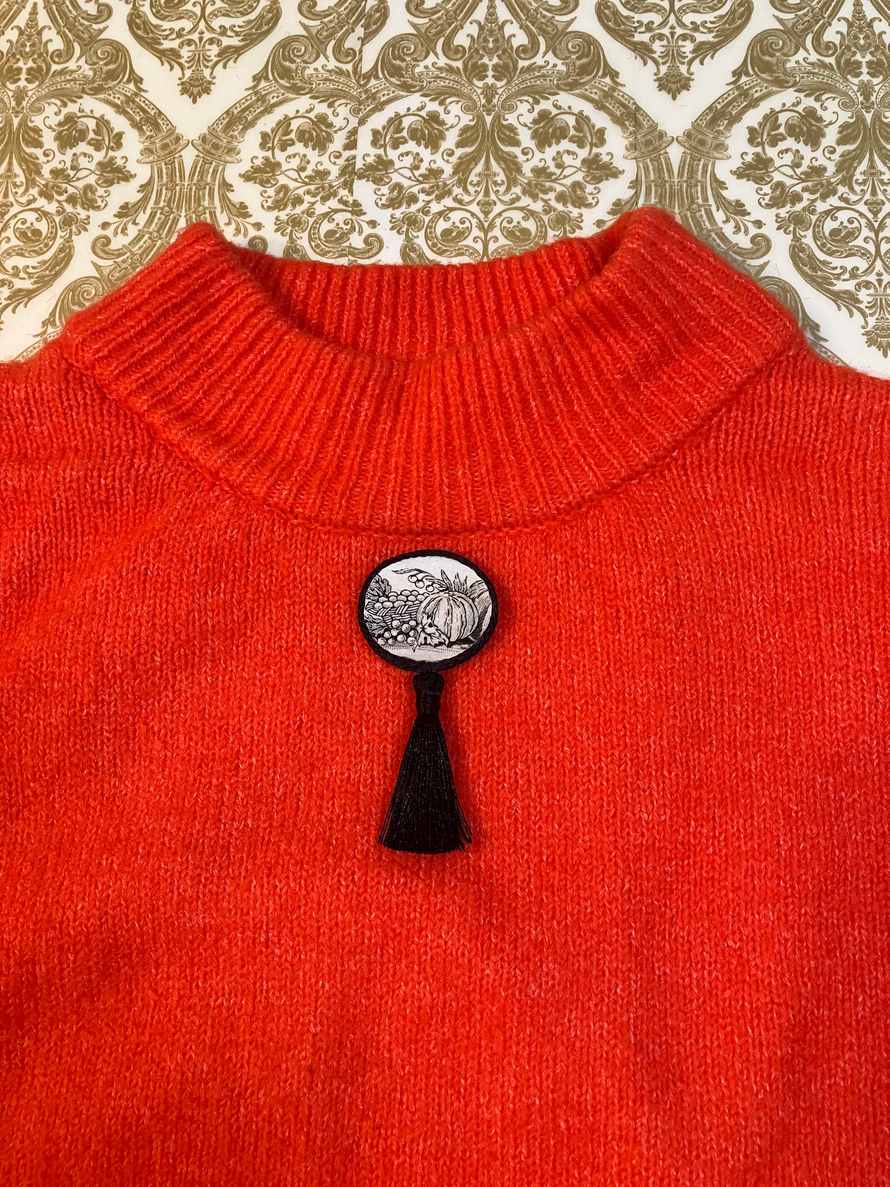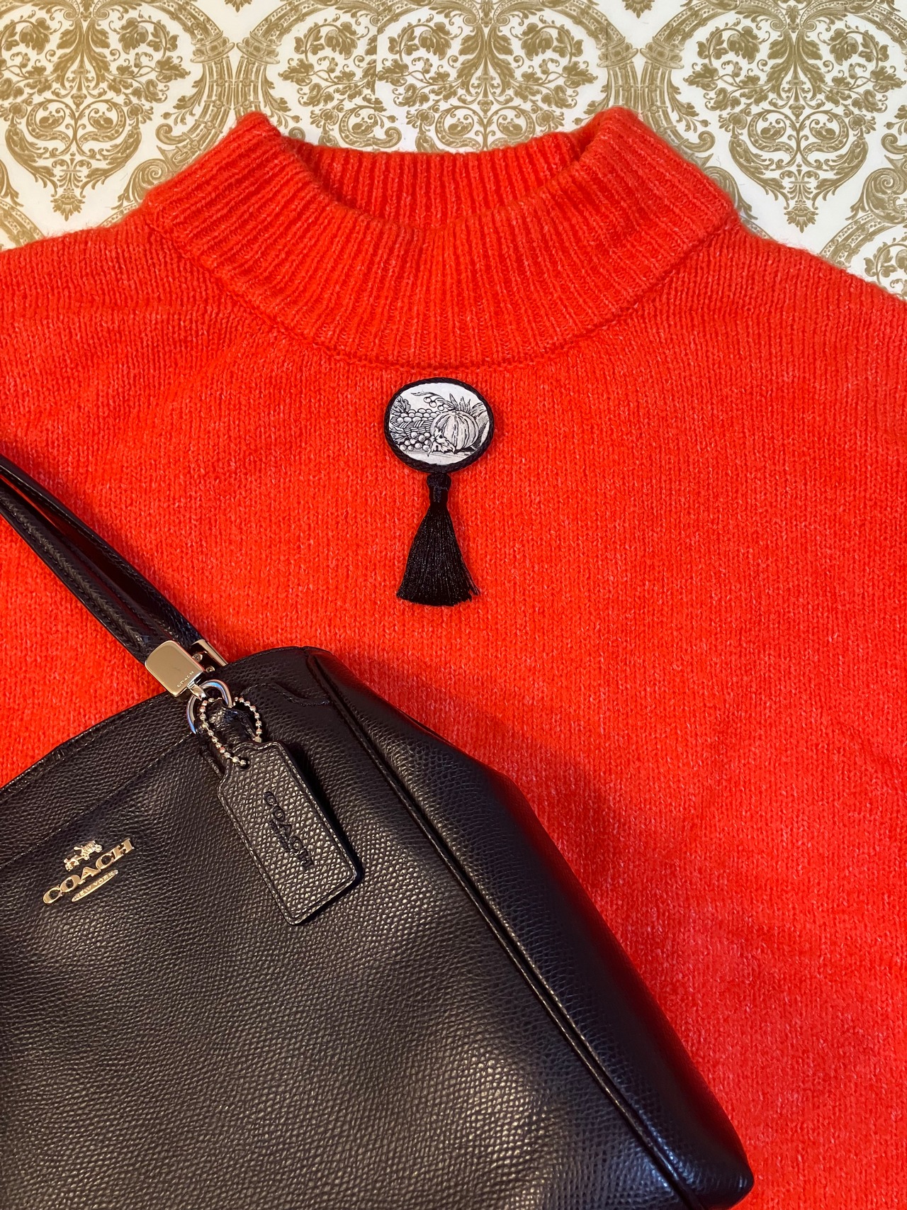 これからの季節、黒い靴、黒いバッグに合わせて使うと、とても重宝するブローチです。