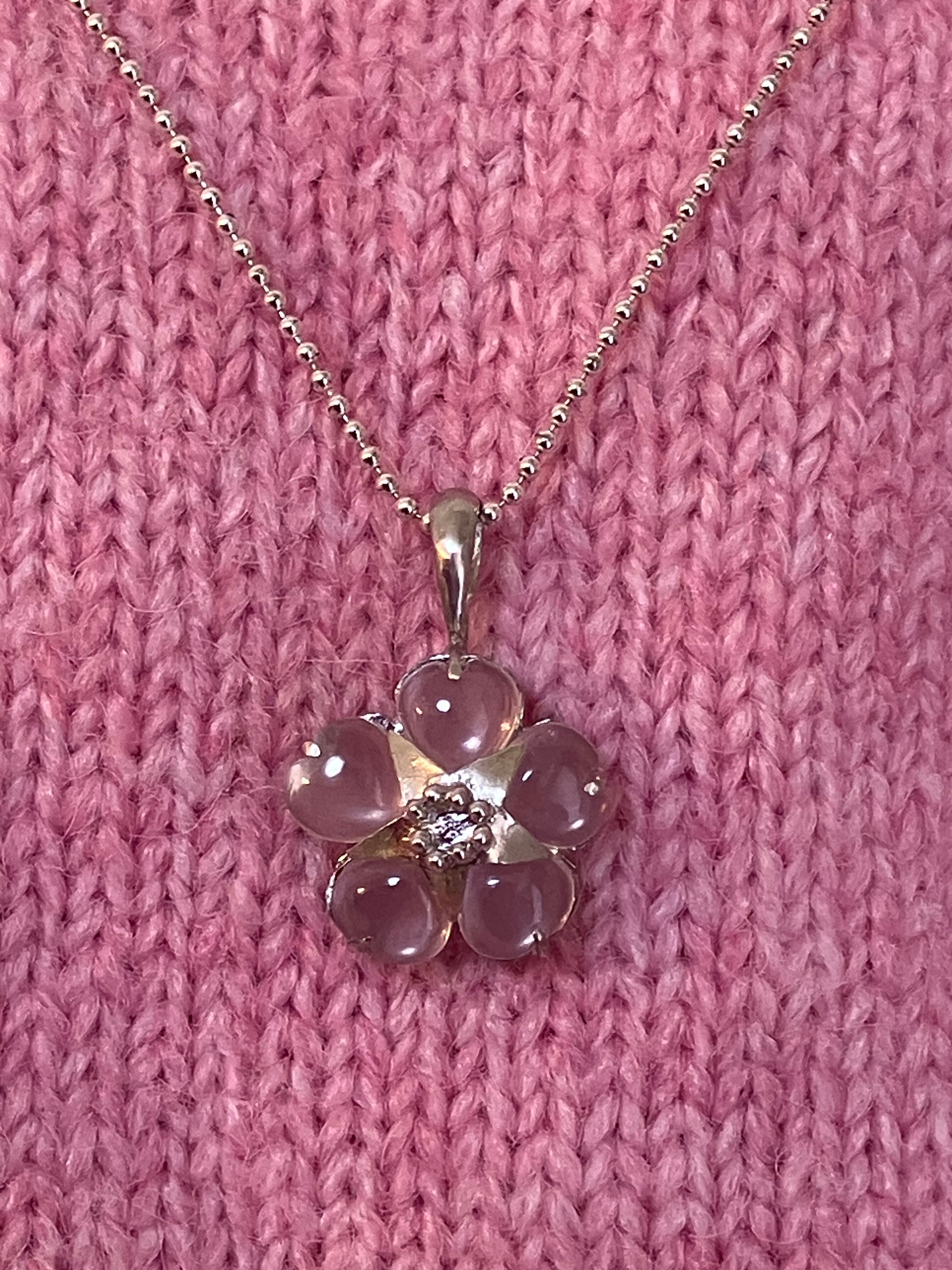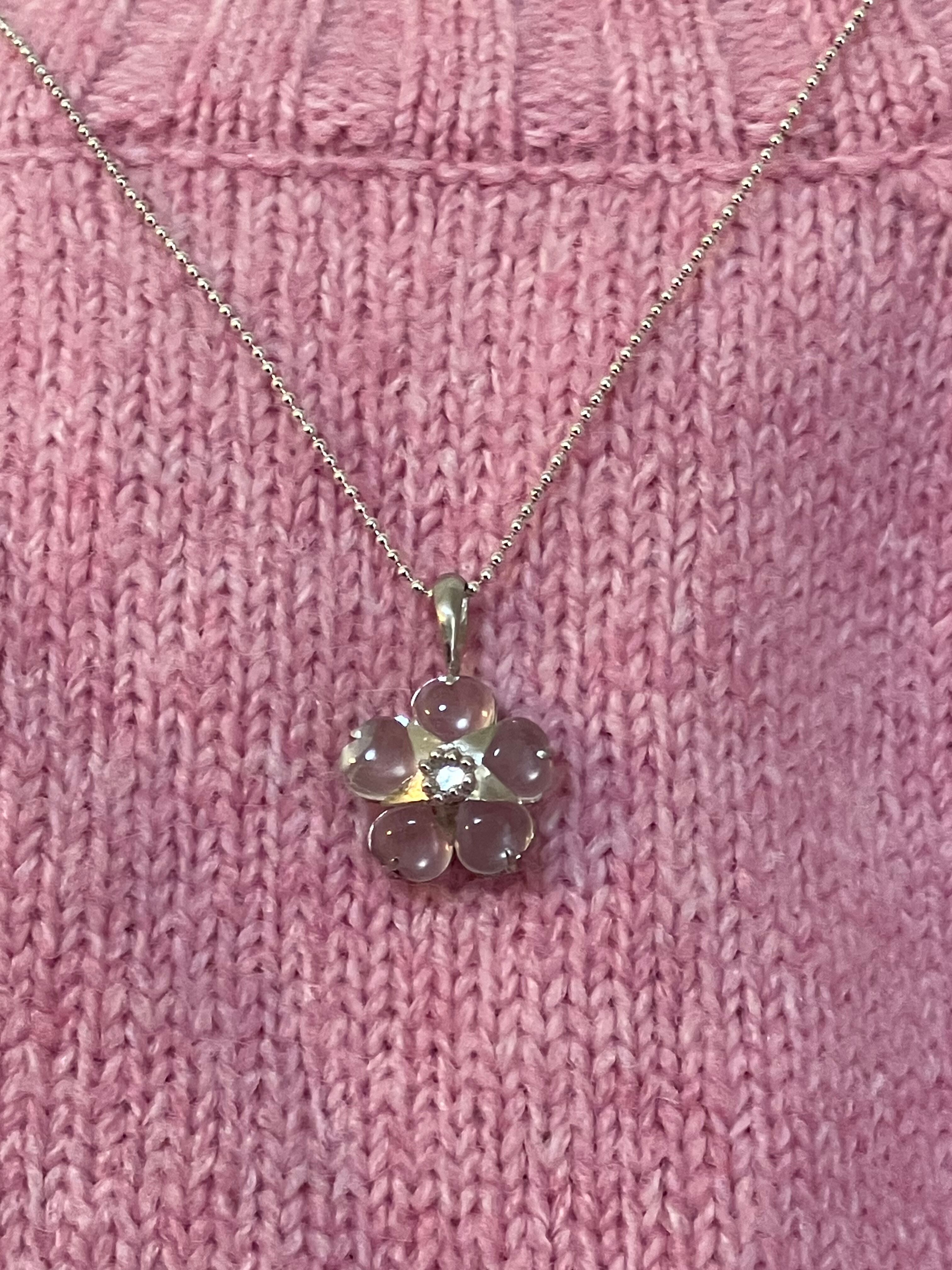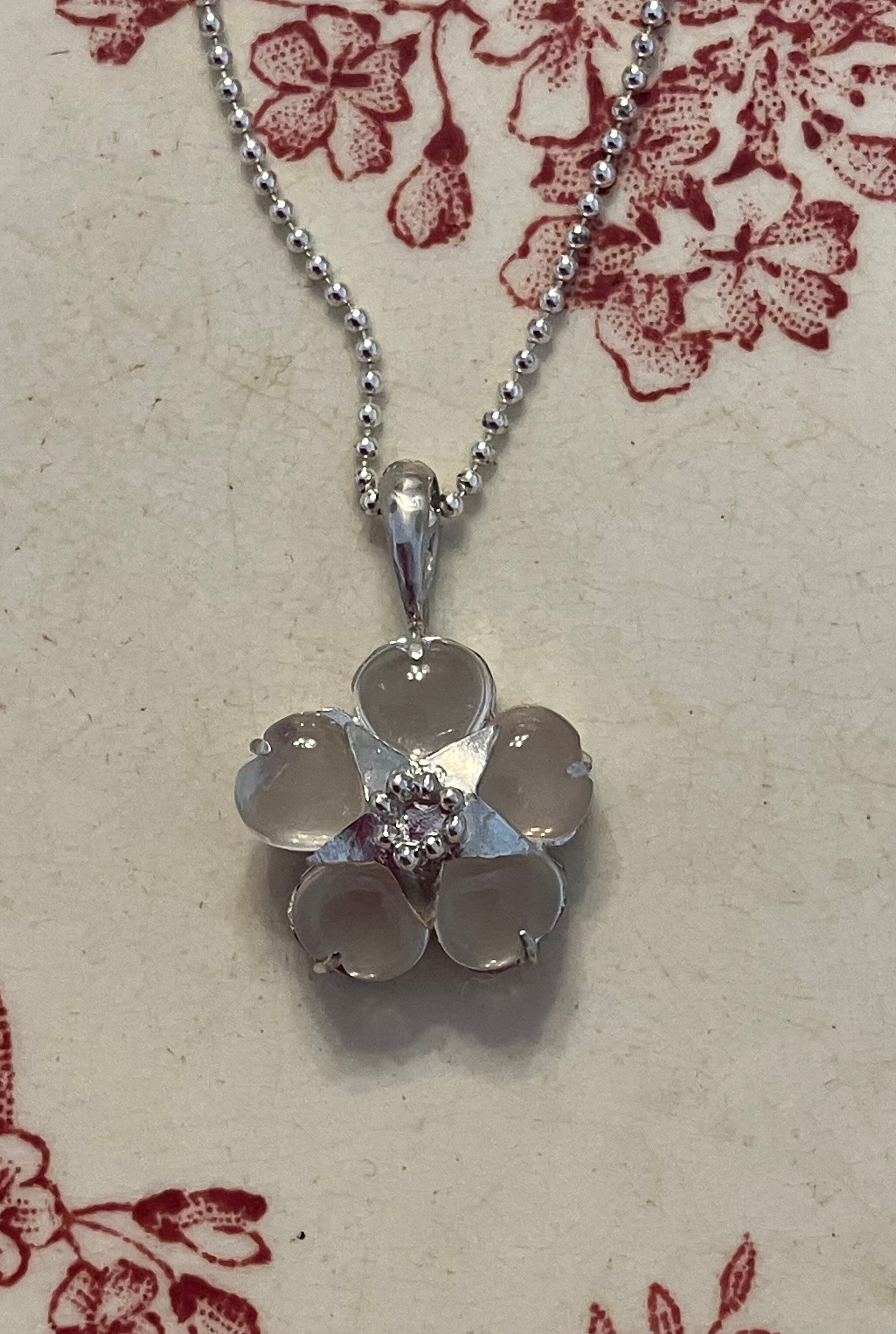 ハート型のローズクォーツのカボションで作った桜のネックレスです。
