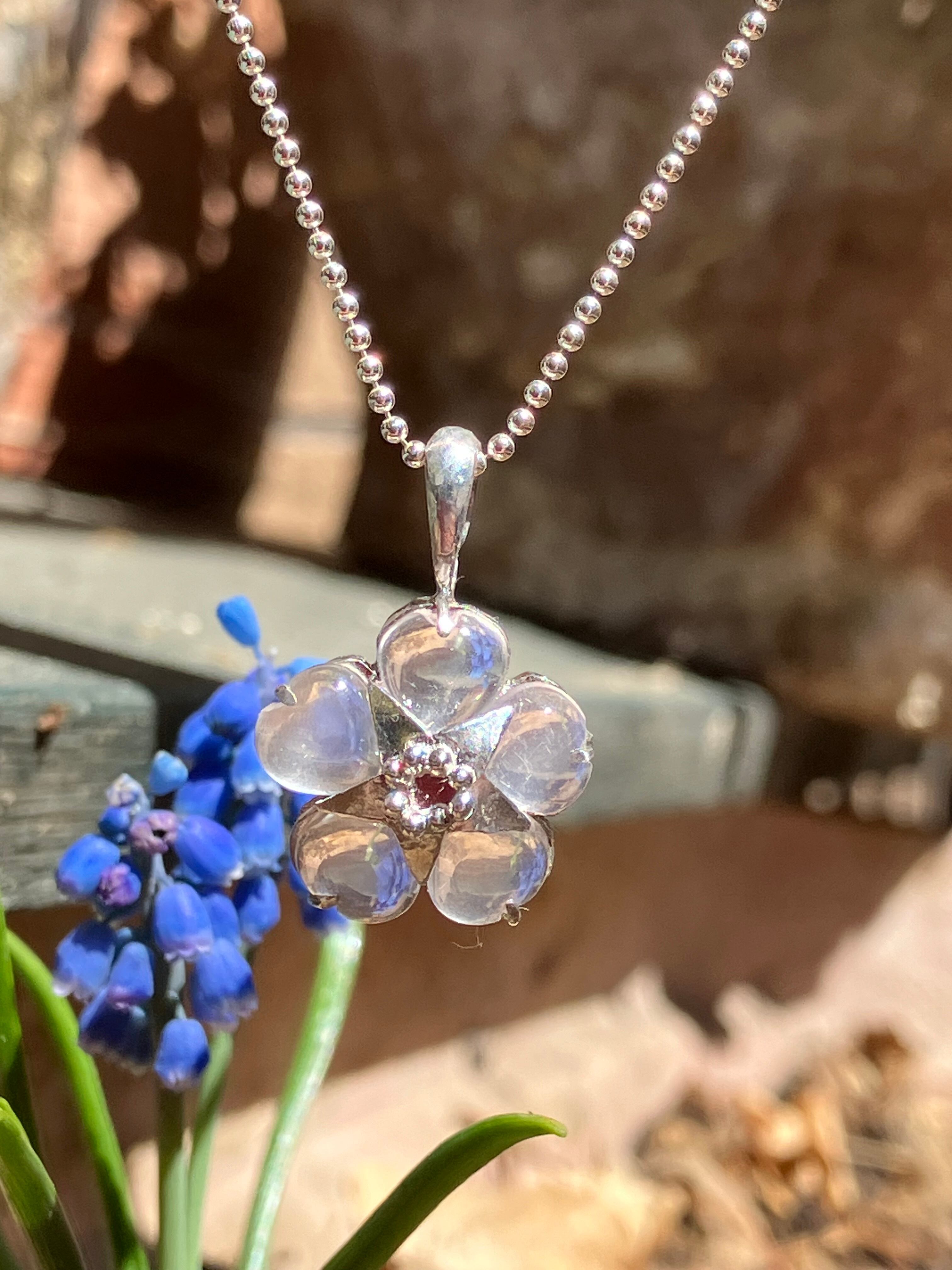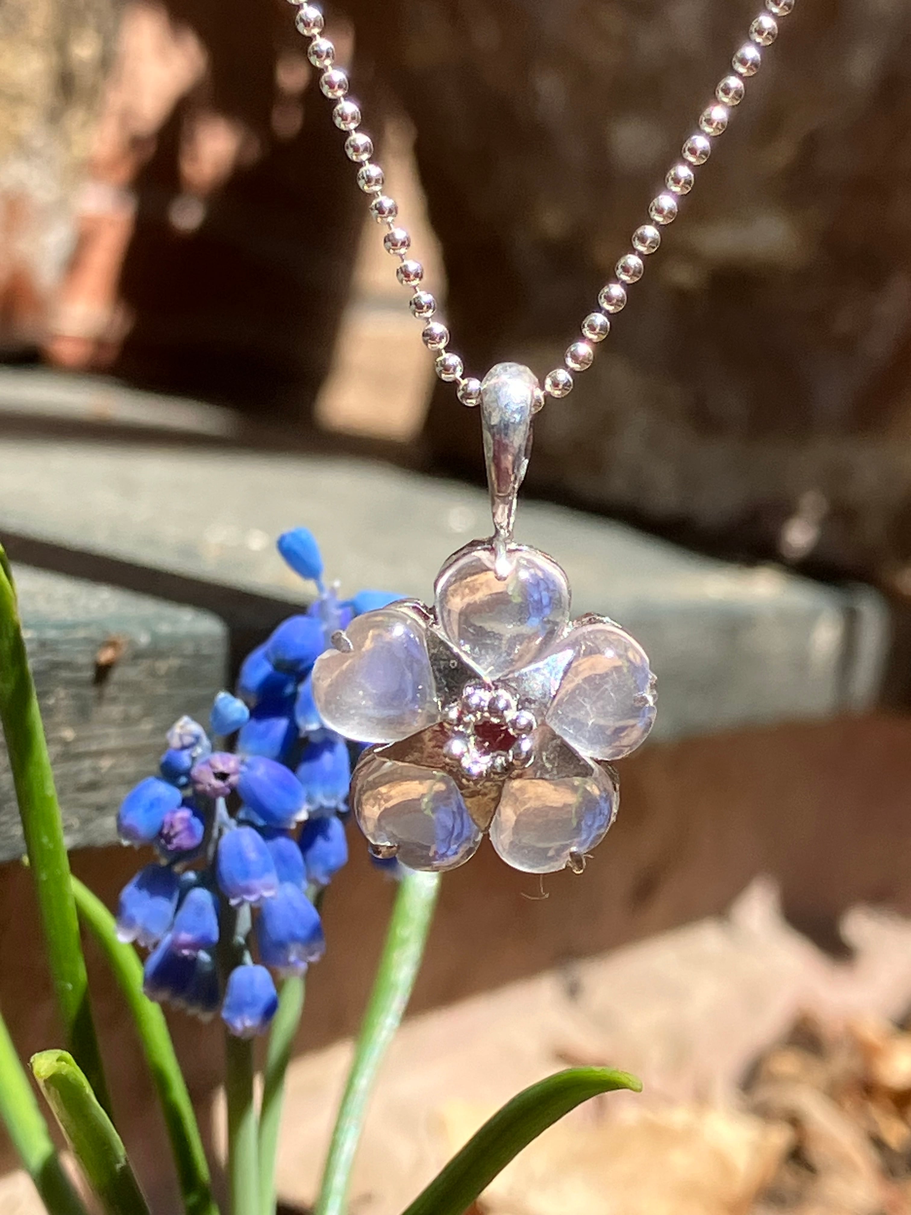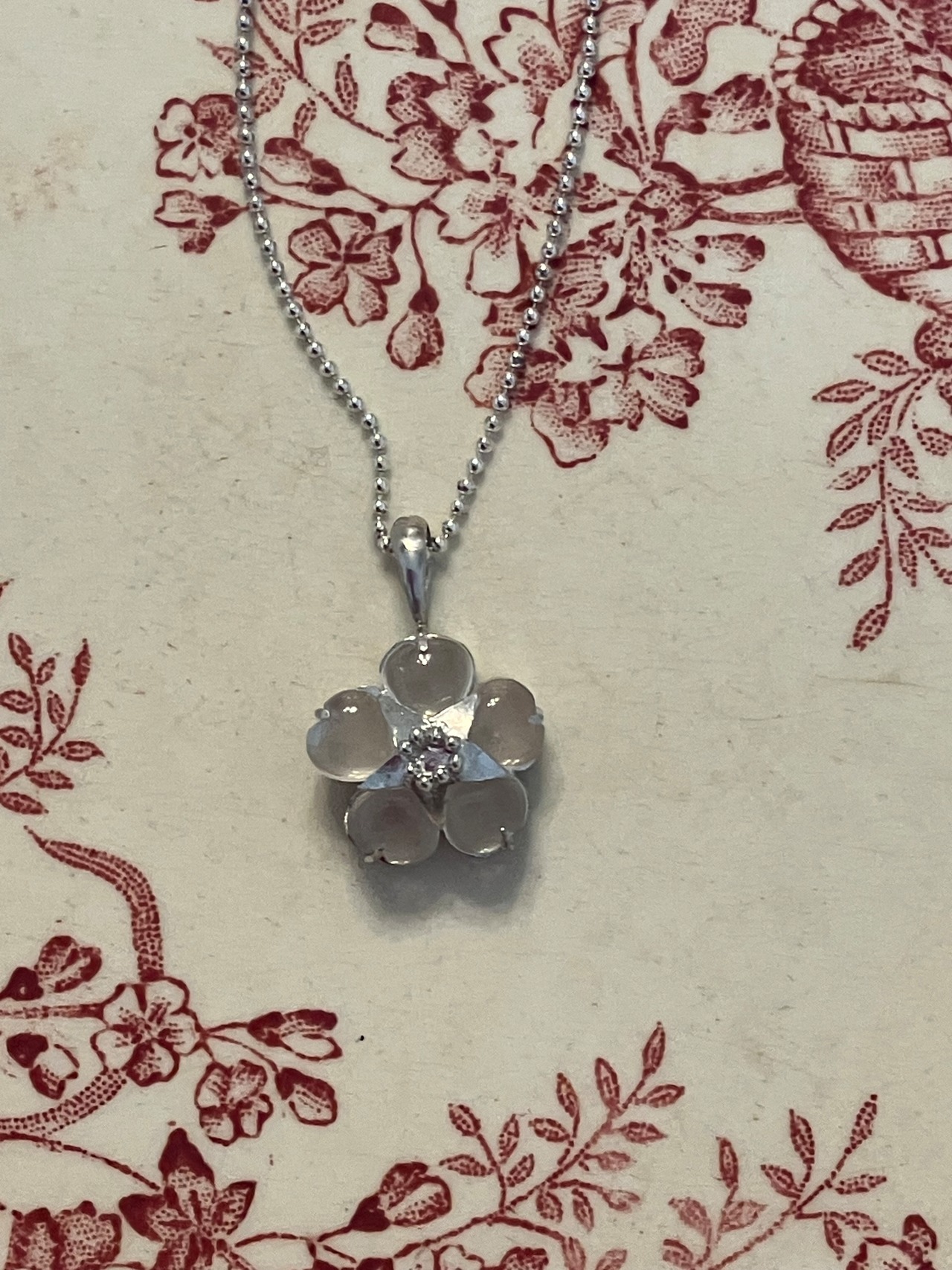 ハート型のローズクォーツのカボションで作った桜のネックレスです。